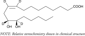 (±)12(13)-DiHOME-d4 is intended for use as an internal standard for the quantification of 12(13)-DiHOME by GC- or LC-MS. 12(13)-DiHOME is the diol form of12(13)-EpOME, a cytochrome P450-derived epoxide of linoleic acid also known as isoleukotoxin.{8529} It is formed from 12(13)-EpOME by soluble epoxide hydrolase (sEH) in neutrophils.{17057}