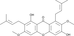 β-Mangostin is a xanthone originally isolated from G. mangostana with diverse biological activites.{39821,39822,39823,39824,39825,39826} It inhibits growth of methicillin-resistant S. aureus (MRSA) and methicillin-susceptible S. aureus (MSSA; MICs = 6.25-12.5 and 6.25-25 μg/ml, respectively), P. falciparum (IC50 = 3 μg/ml), and M. tuberculosis (MIC = 6.25 μg/ml).{39821,39822,39823} β-Mangostin inhibits fatty acid synthase (FASN) with an IC50 value of 24.83 μM.{39824} It induces cell cycle arrest at the G2/M phase and intrinsic and mitochondrial apoptosis in MCF-7 breast cancer cells.{39825} β-Mangostin also inhibits LPS-induced nitric oxide and prostaglandin E2 (PGE2; Item No. 14010) production in RAW264.7 cells and reduces neutrophil infiltration and TNF-α and IL-1β production in a mouse model of carrageenan-induced peritonitis.{39826}