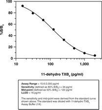 Cayman’s 11-dehydro Thromboxane B2 (11-dehydro TXB2) ELISA Kit is a competitive assay that can be used for the quantification of 11-dehydro TXB2 in plasma, serum, urine, and other sample matrices. The assay has a range of 15.6-2,000 pg/ml, with a midpoint (50% B/B0) of 80-160 pg/ml, and a sensitivity (80% B/B0) of approximately 34 pg/ml.