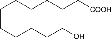 12-hydroxy Lauric acid is a hydroxylated fatty acid that has been found in honey bee royal jelly.{53145} It is active against S. aureus, B. subtilis, B. cereus, E. coli, and P. aeruginosa bacteria (MICs = 6.25-125 ?g/ml) and the fungus C. albicans (MIC = 15.63 ?g/ml).
