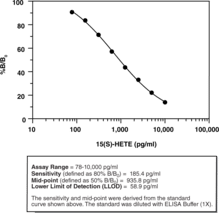 Cayman’s 15(S)-HETE ELISA Kit is a competitive assay that can be used for the quantification of 15(S)-HETE in plasma, serum, whole blood, and urine, as well as other sample matrices. The assay has a range of 78-10,000 pg/ml, with a midpoint (50% B/B0) of 700-1,200 pg/ml, and a sensitivity (80% B/B0) of approximately 185 pg/ml.