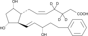 17-phenyl trinor Prostaglandin F2?-d4 (17-phenyl trinor PGF2?-d4) contains four deuterium atoms at the 3, 3′, 4, and 4′ positions. It is intended for use as an internal standard for the quantification of 17-phenyl trinor PGF2? by GC- or LC-mass spectrometry. 17-phenyl trinor PGF2? is a metabolically stable analog of PGF2? and is a potent agonist for the FP receptor. It binds to the FP receptor on ovine luteal cells with a relative potency of 756% compared to that of PGF2?.{2058} At the rat recombinant FP receptor expressed in CHO cells 17-phenyl trinor PGF2? inhibits PGF2? binding with a Ki of 1.1 nM.{1374} The isopropyl ester of 17-phenyl trinor PGF2?-d4 is slightly better than PGF2? isopropyl ester in reducing the intraocular pressure in the cat eye without any irritation.{1107}