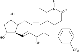Prostaglandin F2? (PGF2?), acting through the FP receptor, causes smooth muscle contraction and exhibits potent luteolytic activity.{187,421,1651} 17-trifluoromethylphenyl trinor Prostaglandin F2? (17-trifluoromethylphenyl trinor PGF2?) is an analog of PGF2? that shares the meta-trifluoromethyl group of travoprost with the 17-phenyl trinor modification of latanoprost. It is anticipated to be a potent and selective agonist of the FP receptor, with potential applications in glaucoma and luteolysis. 17-trifluoromethylphenyl trinor PGF2? ethyl amide is a lipophilic analog of 17-trifluoromethylphenyl trinor PGF2?. Ethyl amides of PGs can serve as prodrugs, as they are hydrolyzed in certain tissues to generate the bioactive free acid.