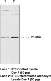 AdPLA2 is the first member of Group XVI phospholipase A2 (PLA2). The PLA2 superfamily consists of multiple enzymes that catalyze the hydrolysis of fatty acids from the sn-2 position in phospholipids. This pH- and calcium-dependent PL is highly expressed in adipose tissue and is associated with adipocyte differentiation and lipolysis. It has been implicated as a major player in the development of obesity.{16809,16829} Human AdPLA2 is a 162 amino acid protein with a calculated molecular weight of 18 kDa. It contains a transmembrane region and shares 70-75% sequence similarity with the mouse and rat proteins, respectively. Cayman’s antibody was raised against the C-terminal region of the human protein.