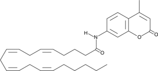 AMC arachidonoyl amide (AMC-AA) is one of several fatty acid amides which can be used to measure fatty acid amide hydrolase (FAAH) activity.{3310} FAAH is a relatively unselective enzyme in that it accepts a variety of amide head groups other than the ethanolamine of its nominal endogenous substrate anandamide (AEA: Item No. 90050).{8928} Exposure of AMC-AA to FAAH activity results in the release of the fluorescent aminomethyl coumarin that absorbs at 360 nm and emits at 465 nm. This allows the fast and convenient measurement of FAAH activity using a simple cuvette or microplate fluorometer.