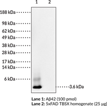 Amyloid plaques composed primarily of the 42 amino acid form of amyloid-? peptide (A?42) are a hallmark of Alzheimer’s disease (AD). However, the roles of the various amyloid ? peptide(s), especially A?42, related to the neurotoxicity characteristic of AD remains unclear. A major hindrance to evaluating the role of A? in AD pathology has been the availability of anti-A? antibodies to selectively detect A? versus amyloid precursor protein (APP), A?40 versus A?42, and specific conformations of the peptide, particularly oligomeric forms. MOAB-2 (mouse IgG2b) is a pan-specific antibody specific to A? (residues 1-4) that differentiates intracellular A? from APP. MOAB-2 does not detect APP in cell culture media/lysates or in brain homogenates from transgenic mice expressing 5 familial AD mutation (5xFAD mice). Intraneuronal A? was confirmed by co-localization of MOAB-2 immunoreactivity with C-terminal antibodies specific for A?40 and A?42, and with cathepsin-D, a lysosomal marker. Additionally, MOAB-2 demonstrates strong intraneuronal and extra-cellular immunoreactivity in 5xFAD and 3xTg mouse brain tissues.{20683}