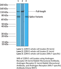 Androgen receptor is a ligand-activated transcription factor and member of the steroid hormone receptor family.{59547,59546} It is composed of an N-terminal regulatory domain (AF-1 site), a DNA-binding domain that contains two zinc fingers, a hinge region containing a nuclear localization signal, and a C-terminal ligand-binding domain (AF-2 site). Unligated androgen receptors are localized to the cytoplasm and bound to heat shock protein 23 (Hsp23), -56, -70, and -90 in a stable conformation that facilitates androgen binding. Androgen binding induces dissociation of the Hsps and nuclear translocation of the androgen receptor where it binds to androgen response elements (AREs) and induces gene transcription. Mutations in AR, the gene encoding the androgen receptor, induce abnormalities in male development ranging from partial androgen insensitivity to complete male-to-female phenotypic sex reversal.{59546} Androgen receptor knockdown induces bone loss, complete loss of sexual behaviors, and reduced aggressive behaviors in male mice, as well as defective folliculogenesis and reduced fertility in female mice. Expression of C-terminally truncated and constitutively active androgen receptor mutants are associated with reduced progression-free survival, lower prostate-specific androgen (PSA) response rates, and shorter median overall survival in patients with castration-resistant prostate cancer.{59548} Cayman’s Androgen Receptor (C-Term) Rabbit Monoclonal Antibody can be used for immunohistochemistry (IHC) and Western blot (WB) applications. The antibody recognizes the C-terminus to detect the full-length androgen receptor and its splice variants from human samples.