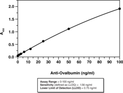 Cayman’s Anti-Ovalbumin IgG1 (mouse) ELISA Kit is an immunometric (i.e., ‘sandwich’) assay which can be used to measure anti-ovalbumin of the IgG1 isotype in mouse plasma and serum without prior sample purification. Affinity-purified anti-ovalbumin IgG1 isolated from the plasma of mice immunized with OVA/alum is used as the standard. The standard curve spans the range of 1.56-200 ng/ml, with an LLOQ of 1.56 ng/ml.