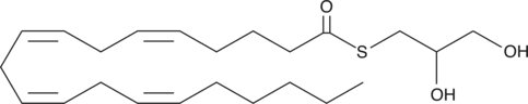 2-Arachidonoyl glycerol (2-AG) is an endogenous agonist of the central cannabinoid (CB1) receptor.{7182,7183} It is present at relatively high levels in the central nervous system and is the most abundant molecular species of monoacylglycerol found in rat brain.{7183,6819} Monoacylglycerol lipase (MAGL) hydrolyzes 2-AG to arachidonic acid and glycerol, thereby terminating its biological actions.{11364} Arachidonoyl-1-thio-glycerol is a thioester substrate analog of 2-arachidonoyl glycerol that can be utilized for the measurement of MAGL activity.{13593} Hydrolysis of the thioester bond by MAGL generates a free thiol that reacts rapidly with the chromogenic reagent DTNB (Ellman’s reagent) resulting a yellow product with an absorbance maximum at 412 nm.