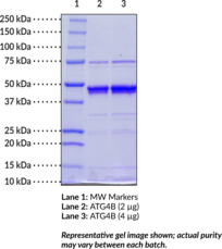 Autophagy-related 4B (ATG4B), also known as autophagin-1, is a cysteine protease and a member of the C54 protease family with dual roles in the progression of autophagy.{42341,42342} It catalyzes the irreversible proteolytic cleavage of human homologs of yeast atg8 belonging to the microtubule-associated proteins 1 (MAP1)A/B-light chain 3 (LC3) and the GABA receptor-associated protein (GABARAP) subfamilies, including LC3, GATE16, GABARAP, and ATG8L, to expose a C-terminal glycine residue that is essential to formation of the autophagosome. It also catalyzes the reversible deconjugation of phosphatidylethanolamine from C-terminal glycine lipid-conjugated atg8 homologs.{42343} ATG4B expression is increased in CD34+ chronic myeloid leukemia (CML) stem and progenitor cells and knockdown of ATG4B expression increases accumulation of LC3-II and p62, indicating impaired autophagy, and reduces the viability and inhibits proliferation of CD34+ CML cells.{42344} Atg4-/- mice exhibit systemic decreases in basal and induced autophagy as well as increased susceptibility to colitis induced by dextran sodium sulfate (DSS) and pulmonary fibrosis induced by bleomycin (Item No. 13877).{42345,42346}