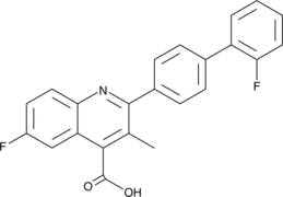 Brequinar is an inhibitor of dihydroorotate dehydrogenase (DHODH; IC50 = ~20 nM), the enzyme that converts dihydroorotate to orotate during de novo pyrimidine synthesis.{39048} Brequinar is selective for DHODH over a panel of greater than 400 kinases at 100 nM. It induces differentiation of ER-HoxA9, U937, and THP-1 cells in vitro (ED50s = ~1 µM) and of tumor cells in a THP-1 mouse xenograft model when administered at doses of 15 mg/kg three times daily and 5 mg/kg per day. It also reduces tumor growth in THP-1, HL-60, and MOLM-13 mouse xenograft models. In a retroviral transduction mouse model of HoxA9 + Meis1 acute myeloid leukemia (AML), brequinar induces differentiation of bone marrow leukemic cells and increases survival.