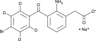 Bromfenac-d4 is intended for use as an internal standard for the quantification of bromfenac (Item No. 23763) by GC- or LC-MS. Bromfenac is an inhibitor of cyclooxygenase 2 (COX-2; IC50 = 6.6 nM) that is selective over COX-1 (IC50 = 210 nM).{39441} It inhibits prostaglandin E2 (PGE2; Item No. 14010) production in a rabbit model of LPS-induced eye inflammation. Bromfenac also decreases inflammation following cataract removal in dogs when administered as a 0.9% topical solution on a tapering schedule for 24 weeks.{39440} Formulations containing bromfenac have been used in the treatment of postoperative inflammation following cataract surgery.