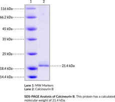 Calcineurin B is the regulatory subunit of calcineurin, a serine/threonine phosphatase with roles in T cell activation, cardiac function, learning and memory, apoptosis, and cell cycle regulation.{61745,61746} It is encoded by two genes in mammals, PPP3R1, which is expressed in all tissues except the testes, and the testicular-restricted isoform PP3R2.{61745,61747} Calcineurin B is a calcium-binding protein that contains four EF-hand calcium-binding sites, and calcium binding to calcineurin B is essential to both the phosphatase activity of calcineurin A and binding of inhibitor complexes to calcineurin.{61748,61749} Cayman’s Calcineurin B (human, recombinant) protein can be used for binding assays. This protein consists of 187 amino acids and has a calculated molecular weight of 21.4 kDa.