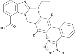 Candesartan-d4 is intended for use as an internal standard for the quantification of candesartan by GC- or LC-MS. Candesartan is an antagonist of the angiotensin II type 1 (AT1) receptor (Kis = 0.17, 0.12, and 0.12 nM for human AT1, rat AT1A, and rat AT1B recombinant receptors, respectively) and an active metabolite of the prodrug candesartan cilexitil (Item No. 10489).{28032} It is selective for AT1 over AT2 receptors (Ki = 26,500 nM for the human recombinant AT2 receptor). It inhibits angiotensin II-induced contraction of isolated rabbit aortic strips and increases in blood pressure in rats following intravenous administration (ID50 = 0.033 mg/kg).{42295} Formulations containing candesartan have been used in the treatment of hypertension and heart failure.