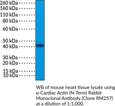 ?-Cardiac actin is one of the main actin isoforms found in adult cardiac muscle and the predominant actin in the embryonic heart.{60039,60040} It is a globular protein that forms microfilaments at the Z-disc of sarcomeres and interacts with myosin to perform myofilament, and thus cardiac muscle, contractions.{60041} Knockout of Actc1, the gene encoding ?-cardiac actin, is embryonic lethal in approximately half of mice and generally lethal within two weeks of birth for the other 50%.{60039} Mutations in ACTC1 are associated with atrial septal defects, familial hypertrophic cardiomyopathy, and idiopathic dilated cardiomyopathy.{60040,60042} Cayman’s ?-Cardiac Actin (N-Term) Rabbit Monoclonal Antibody can be used for immunohistochemistry (IHC) and Western blot (WB) applications.