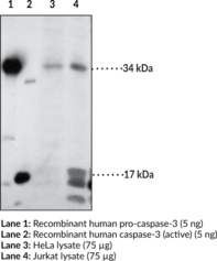 Apoptosis is associated with many diseases and is induced by a family of cell death receptors and their ligands. Cell death signals are transduced by death domain containing adapter molecules and members of the caspase family of proteases. Caspase-3 is a key effector caspase in the apoptosis cascade.{7216,6292} The enzyme is efficiently activated by caspase-8, caspase-9, and granzyme B resulting in 17 and 12 kDa active subunits formed from the 34 kDa proenzyme.{7216, 8444} The substrates of caspase-3 are numerous and include pro- and anti-apoptotic proteins, downstream components of the apoptotic machinery (for example, ICAD), as well as structural and homeostatic proteins.{7216,6292} DNA fragmentation and the morphological changes associated with this final stage of apoptosis appears to be dependent upon caspase-3.{6291} Caspase-3 is expressed in a variety of tissues and cells.{8444,8443}
