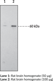 The CB1 receptor and the splice variant CB1a are localized mainly in the brain.{6628,6726,6724} The CB1 receptor is a G-protein coupled receptor that binds the active component of cannabis, ?9-tetrahydrocannabinol. Human and rat CB1 receptors exhibit 97.3% homology at the amino acid level over the complete protein, and 100% homology within the peptide sequence used to make this antibody.{6629,6628} This peptide exhibits no homology with the CB2 receptor. Based on the amino acid sequence, the CB1 receptor has a molecular weight of approximately 52,800.{6628} The CB1 receptor and the splice variant CB1a are localized mainly in the brain, whereas the CB2 receptor is localized predominantly in peripheral tissues, including the spleen and hemopoietic cells.{6629,6628,6726,6724} Cayman’s CB1 Receptor Polyclonal Antibody can be used for Western blot and immunohistochemistry applications. The antibody recognizes the N-terminal extracellular region of the CB1 receptor at 40 kDa from human samples.