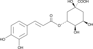 Chlorogenic acid is a phenolic natural product isolated from the leaves and fruits of dicotyledonous plants, including the coffee bean. Structurally, chlorogenic acid is the ester of caffeic acid with the 3-hydroxyl group of quinic acid. Chlorogenic acid is an important factor in plant metabolism. It is also an antioxidant and an inhibitor of the tumor promoting activity of phorbol esters.{1430,1420} Chlorogenic acid, at concentrations as high as 100 µM, does not inhibit the 5-lipoxygenase activity of ionophore-stimulated human polymorphonuclear leukocytes.{4706}