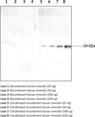 Vimentin is a cytoskeleton intermediate filament protein present in cells of mesenchymal origin, including leukocytes, endothelial cells, and smooth muscle cells. It is subject to citrullination by peptidyl arginine deiminase 2 (PAD2; Item No. 10785) under high calcium concentrations, which can occur during macrophage apoptosis.{31884} Citrullinated vimentin has been shown to have a role in the production of anti-citrullinated protein antibodies (ACPAs).{31884,31883,55252} ACPAs against citrullinated proteins, such as vimentin, are considered to be highly specific markers for rheumatoid arthritis and other autoimmune diseases.{31883,55252} Cayman’s Citrullinated Vimentin Monoclonal Antibody (Clone 12G11) can be used for Western blot (WB), ELISA, and immunoprecipitation (IP) applications. The antibody recognizes citrullinated vimentin at ~54 kDa from human samples.
