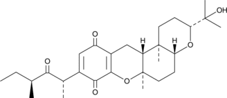 Cochlioquinone is a sesquiterpene metabolite originally isolated from C. miyabeanus.{39758} It is a phytotoxin that inhibits root growth of finger millet (E. coracana) and rice plants (O. sativa) by 59.9 and 51.7%, respectively, when used at a concentration of 100 ppm.{39759} Cochlioquinone B inhibits NADH oxidase and NADH-2,3-dimethoxy-5-pentyl-1,4-benzoquinone reductase from bovine heart mitochondria.{39760}