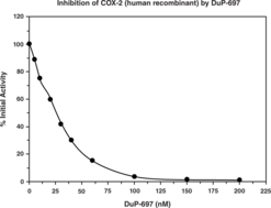 Cyclooxygenase (COX, also called Prostaglandin H Synthase or PGHS) is a bifunctional enzyme exhibiting both COX and peroxidase activities. The COX component converts arachidonic acid to a hydroperoxy endoperoxide (PGG2), and the peroxidase component reduces the endoperoxide to the corresponding alcohol (PGH2), the precursor of PGs, thromboxanes, and prostacyclins.{500,501} It is now well established that there are two distinct isoforms of COX, COX-1 and COX-2. Cayman’s COX Fluorescent Inhibitor Screening Assay provides a convenient fluorescence-based method for screening ovine COX-1 and human recombinant COX-2 for isozyme-specific inhibitors. The assay utilizes the peroxidase component of COXs. In this assay, the reaction between PGG2 and ADHP (10-acetyl-3,7-dihydroxyphenoxazine) produces the highly fluorescent compound resorufin. Resorufin fluorescence can be analyzed with an excitation wavelength of 530-540 nm and an emission wavelength of 585-595 nm.