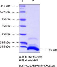 Chemokine (C-X-C motif) ligand 12 (CXCL12) is a homeostatic chemokine and member of the CXC chemokine subfamily.{56125} Alternative splicing of CXCL12 produces six isoforms that exhibit isoform-specific tissue distribution.{56124} CXCL12? is ubiquitously expressed and is composed of an N-terminal receptor binding domain, a glycosaminoglycan-binding domain, and a C-terminal domain.{56125,56124} CXCL12? binds to atypical chemokine receptor 3 (ACKR3) and chemokine (C-X-C motif) receptor 4 (CXCR4) to induced ?-arrestin and G protein-coupled receptor signaling, respectively.{56125} It enhances hematopoietic progenitor cell survival and chemotaxis.{56122} CXCL12? promotes axonal elongation of primary spinal cord motor neurons and administration of an anti-Cxcl12? antibody delays neuromuscular nerve junction regeneration in a mouse model of ?-latrotoxin-induced neuromuscular degeneration.{56123} Cayman’s CXCL12? (human, recombinant) protein consists of 84 amino acids and has a calculated molecular weight of 10 kDa.