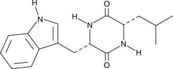 Cyclo(L-Leu-L-Trp) is a diketopiperazine metabolite originally isolated from Penicillium.{39706} It is active against various bacteria (MICs = 125-1000 µg/ml) and fungi (MICs = 8-64 µg/ml), and it inhibits the production rate of hydroxy radicals in an electron spin resonance (ESR) spectroscopy-based assay (IC50 = 1.8 µM).{39707,39708} Cyclo(L-Leu-L-Trp) is a bitter tastant that can rapidly permeate rat taste cell membranes ex vivo when used at a concentration of 1 mM.{39709} It also acts as a melatonin receptor agonist in X. laevis melanophores, inhibiting cAMP accumulation when used at a concentration of 20 µM, an effect that is blocked by the melatonin receptor antagonist luzindole (Item No. 15998).{39710}