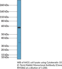 Cytokeratin 10 (CK-10) is a type I acidic epithelial intermediate filament protein.{52912} It is composed of a central rod containing four ?-helical domains, which are important for self-assembly, and non-helical head and tail domains at the N- and C-termini, respectively.{15723} CK-10 expression is induced upon keratinocyte differentiation, increasing during keratinocyte migration from the basal layer to the suprabasal layer of the epidermis.{52912} It dimerizes with the type II epithelial intermediate filament protein CK-1 via heptad repeats in the central rod domain to form a network of filament bundles throughout the cytoplasm.{58060} Increased tumor CK10 expression has been found in patients with hepatocellular carcinoma (HCC) and is associated with poor prognosis.{60204} CK10 mutations have been found in patients with epidermolysis bullosa simplex (EBS), a disorder characterized by skin blistering.{58060} Cayman’s Cytokeratin 10 (C-Term) Rabbit Monoclonal Antibody can be used for immunohistochemistry (IHC) and Western blot (WB) applications.