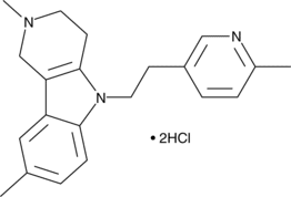 Dimebolin is a neuroprotective agent.{17760,15457,17770} It binds to histamine H1 and H2 receptors (IC50s = 3.8 and 287 nM, respectively), as well as ?1A-, ?1B-, ?1D-, and ?2A-adrenergic receptors (ARs), imidazoline I2 receptors, and the serotonin (5-HT) receptor subtypes 5-HT2A, 5-HT2C, 5-HT6, and 5-HT7 (Kis = 8-313 nM).{49510} It also inhibits NMDA-evoked currents and voltage-gated calcium channels in mouse primary striatal neurons (IC50s = 10 and 50 ?M, respectively).{17760} Dimebolin (50 ?M) inhibits glutamate-induced apoptosis in primary striatal neurons derived from the YAC128 transgenic mouse model of Huntington’s disease. It inhibits cell death induced by amyloid-? (25-35) (Item No. 24155) in cerebellar granule cells when used at a concentration of 25 ?M.{15457} Dimebolin (1 mg/kg) inhibits decreases in two-way active avoidance reaction (TWAA) acquisition in a rat model of Alzheimer’s disease induced by 1-ethyl-1-(2-hydroxyethyl) aziridinium (AF64A).{17770}