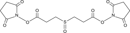 Disuccinimidyl sulfoxide (DSSO) is a protein cross-linking probe designed to be used with mass spectrometry (MS). It contains two symmetric collision-induced dissociation (CID)-cleavable sites that allow effective identification of DSSO-cross-linked peptides based on their distinct fragmentation patterns.{32323} The CID-induced separation of interlinked peptides in MS/MS permits MS3 analysis of single peptide chain fragment ions with defined modifications, due to DSSO remnants, for easy interpretation and unambiguous identification using existing database searching tools.{32323}