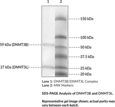 DNA methyltransferase 3B (DNMT3B) and DNMT3L are members of the DNMT3 family.{19542,66086} DNMT3B is composed of variable N-terminal, proline-tryptophan-tryptophan-proline (PWWP), cysteine-rich, and C-terminal catalytic domains. DNMT3L has a similar sequence to DNMT3B but lacks the PWWP domain and residues in the C-terminal domain that are required for DNA methyltransferase activity.{19542} DNMT3B and DNMT3A are responsible for de novo methylation of cytosines in cytosine-phosphate-guanine (CpG) sites of DNA in germ cells and embryos and DNMT3L is required for their activity.{19542,66086,19545} The methylation patterns established by the DNMT3 family are maintained by DNMT1.{66086} Mutations in DNMT3B are associated with ICF syndrome, which is characterized by immune defects, centromeric instability, and facial anomalies.{19542} Cayman’s DNMT3B/DNMT3L Complex (human, recombinant) protein can be used for enzyme assays.