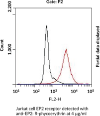 This polyclonal antibody is labeled with R-Phycoerythrin (PE) and can be used for immunofluorescent labeling of cellular EP2 receptor following permeabilization. R-PE absorption maxima occurs at 565>540>498 nm and the emission maximum occurs at 578 nm, however standard excitation by 488 nm lasers is sufficient to generate signal detected in the PE channel of flow cytometers. The biological effects of prostaglandin E2 (PGE2) are mediated through interaction with four distinct membrane-bound G-protein coupled EP receptors: EP1, EP2, EP3, and EP4.{1422,4345} Binding of PGE2 to the EP2 receptor results in an increase in adenylate cyclase activity with a subsequent increase in cAMP.{10096,5500} Pharmacologically, EP2 receptors mediate relaxation of smooth muscle and are distinguished from EP4 receptors by their sensitivity to the EP2 receptor selective agonist butaprost.{1422,4345,10096} The human EP2 receptor is comprised of 358 amino acids with a molecular mass of approximately 40,000.{10096} mRNA for the EP2 receptor is expressed in a variety of tissues including lung, placenta, spleen, intestine, kidney, and sensory neuron.{10096,5500,9050}