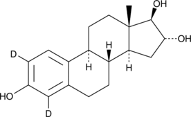 Estriol-d2 is intended for use as an internal standard for the quantification of estriol (Item Nos. ISO60164 | 10006484) by GC- or LC-MS. Estriol is a metabolite of estradiol (Item Nos. ISO60155 | 10006315) and a major estrogen produced in the later stages of pregnancy. In a longitudinal study in healthy pregnant women, total plasma estriol levels increased from 15873) and serves as a direct marker of fetal adrenal gland activity.{7766} Saliva contains primarily unbound and unconjugated estriol and is commonly used for monitoring estriol levels.{7766,7799} Plasma levels of estriol in males and non-pregnant females is less than 2 ng/ml.{7647}