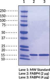 Fatty acid binding protein-4 (FABP4; Adipocyte-FABP) is one of nine known cytosolic fatty acid binding proteins ranging in size from 14-15 kDa containing 127-132 amino acids.{11979} Members of this protein family exhibit high affinity for small lipophilic ligands and were named according to the tissue from which they were initially isolated.{11979} Studies suggest that FABPs are involved in the uptake and metabolism of fatty acids, in the maintenance of cellular membrane fatty acid levels, in intracellular trafficking of these substrates, in the modulation of specific enzymes of lipid metabolic pathways, and in the modulation of cell growth and differentiation.{11977} Studies using FABP4 gene deletion in mice indicate a dominant role for FABP4 in several chronic metabolic diseases. Therefore, inhibiting the function of FABP4 is a potential mechanism for the treatment of metabolic diseases like diabetes and atherosclerosis.{14840,12286}