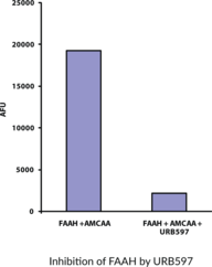 Fatty acid amide hydrolase (FAAH) is a serine hydrolase with a major role in the hydrolysis of endocannabinoids.{3310,64262,64263} It is composed of an N-terminal transmembrane domain, a catalytic domain containing an amidase signature sequence, a polyproline sequence, and a monotopic membrane binding domain.{64263} FAAH is localized to microsomal and mitochondrial membranes and is highly expressed in the CNS but can also be found in peripheral tissues such as lung, gastrointestinal tract, kidney, liver, bladder, prostate, and testis.{64262,13132} It primarily catalyzes the inactivation of the endogenous endocannabinoid arachidonoyl ethanolamide (AEA; Item No. 90050) via hydrolysis to arachidonic acid and ethanolamine but has broad substrate selectivity towards fatty acid amides, including oleamide, N-acyltaurines, and other N-acylethanolamines.{64262} Genetic or pharmacologic knockdown of FAAH increases levels of AEA and dampens pain sensitivities and inflammatory endpoints in rodent models of inflammatory pain, allergic contact dermatitis, inflammatory bowel disease, and neuropathic pain.{18613}
