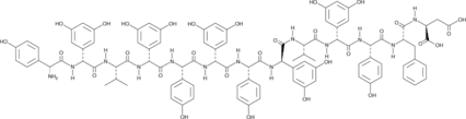 | Smiles | OC1=CC=C([C@@H](N)C(N[C@H](C2=CC(O)=CC(O)=C2)C(N[C@@H](C(C)C)C(N[C@H](C3=CC(O)=CC(O)=C3)C(N[C@@H](C4=CC=C(O)C=C4)C(N[C@H](C5=CC(O)=CC(O)=C5)C(N[C@@H](C6=CC=C(O)C=C6)C(N[C@@H](C(N[C@@H](C(C)C)C(N[C@H](C7=CC(O)=CC(O)=C7)C(N[C@@H](C8=CC=C(O)C=C8)C(N[C@H](C(N[C@H](C(O)=O)CC(O)=O)=O)CC9=CC=CC=C9)=O)=O)=O)=O)C=CC(O)=CC(O)=C)=O)=O)=O)=O)=O)=O)=O)C=C1 |