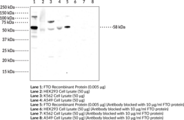 Fat mass and obesity-associated (FTO) protein is a nuclear-residing N6-methyladenosine (m6A) RNA demethylase that is encoded by the FTO gene in humans.{48528,19167,48529} It is composed of an N-terminal domain similar in structure to members of the AlkB non-heme iron-containing dioxygenase family and a C-terminal domain that is not similar to other known domains.{35510} The N-terminal domain contains a loop not found in other AlkB proteins that may be responsible for its specificity for single-stranded nucleic acids. FTO is highly expressed during development and in the adult brain, adipose tissue, and muscle and its expression is modified by the availability of essential amino acids in vitro and following fasting or a chronic high-fat diet in vivo in mice.{48529,48530,48531} FTO regulates mRNA splicing and is required for adipogenesis.{48528,48532} Knockdown of Fto in mice increases m6A-containing transcripts of the adipogenesis-related gene Runx1t1, enhances binding of the splicing regulatory protein Srsf2 to Runx1t1, which induces the inclusion of Runx1t1 exon 6 and the production of long Runx1t1 transcripts, and leads to inhibition of pre-adipocyte differentiation. Fto is associated with obesity in transgenic mouse models, with overexpression increasing food intake and weight gain and knockout reducing body weight, body length, fat mass, and white adipose tissue, as well as increasing energy expenditure while decreasing locomotor activity.{19167} FTO SNPs are associated with body mass index and obesity risk in humans.{48531,48533} Cayman’s FTO (human) Polyclonal Antibody can be used for ELISA, Immunoflourescence (IF), Immunohistochemistry (IHC), and Western blot (WB) applications. The antibody recognizes FTO at 58 kDa from human samples.