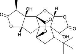 Ginkgolide A is a terpenoid lactone originally isolated from G. biloba leaves with diverse biological activities.{22384} Ginkgolide A inhibits platelet activating factor-dependent aggregation of human platelets (IC50 = 15.8 ?g/ml).{43127} It also inhibits GABA-induced currents in Xenopus oocytes expressing human ?1?2?2L GABAA receptors with an IC50 value of 12 ?M.{43128} Ginkgolide A (100 ?M) reduces the proliferation rate of OVCA429 ovarian cancer cells by 40%.{43129} In vivo, ginkgolide A (1-2 mg/kg, p.o.) increases the time spent in the open arms of the elevated plus maze by 3-fold without altering activity level in mice, indicating anxiolytic-like activity.{43131} Ginkgolide A (10 mg/kg, p.o.) also reduces hexobarbital-induced sleeping time in mice by 44%.{43130} Ginkolide A (30 mg/kg per day) increases activity of the cytochrome P450 (CYP450) isoforms CYP1A2 and CYP2E1 by 1.82- and 1.27-fold, respectively, in rats.{22384}