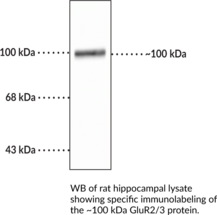 AMPA receptors are ionotropic glutamate receptors that mediate excitatory synaptic transmission.{46955,46957} They are tetrameric protein complexes expressed throughout the central nervous system in both neurons and glia that are assembled from combinations of GluR1, GluR2, GluR3, and GluR4, also known as GluR-A-D, subunits, each of which has extracellular N-terminal and ligand binding domains, a channel domain consisting of three membrane-spanning helices and a channel pore loop, and an intracellular C-terminus.{46955,46956,46958,46959} GluR1 and GluR2 are predominantly expressed in the forebrain, with low levels of GluR3 and GluR4, and pyramidal neurons express AMPA receptors primarily comprised of heterotetramers of GluR1 and GluR2 subunits. Hippocampal pyramidal neurons also express AMPA receptors composed of GluR2 and GluR3 (GluR2/3) that cycle into and out of synapses constitutively.{46952} Protein levels of GluR2/3 are decreased in postmortem enterorhinal cortex, frontal cortex, and Purkinje cell samples from patients with sporadic Creutzfeldt-Jakob disease.{46953} GluR2/3 protein levels are increased on the dendrites of dentate granule cells in postmortem epileptogenic hippocampus samples from patients with temporal lobe epilepsy.{46954} Cayman’s GluR2/3 Polyclonal Antibody can be used for Western blot (WB) applications. The antibody recognizes GluR2/3 at approximately 100 kDa from rat samples.
