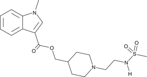 GR113808 is an antagonist of the serotonin (5-HT) receptor subtype 5-HT4.{42967} It binds to 5-HT4 receptors with an IC50 value of 0.4 nM in COS-7 cells expressing the human recombinant receptor and in guinea pig striatal membranes (IC50 = 0.5 nM).{42968} GR113808 is selective for 5-HT4 receptors over 5-HT1 receptors (Kis = >10 µM in dog saphenous vein and porcine vena cava), as well as 5-HT2 and 5-HT3 receptors (Kis = >10 and 1 ?M in rabbit thoracic aorta and rat cerebral cortex, respectively).{42967} It is also selective for 5-HT4 over adenosine, adrenergic, dopamine, GABA, muscarinic, nicotinic, histamine, and NMDA receptors (Kis = >10 ?M for all). GR113808 inhibits relaxation induced by 5-HT (Item No. 14332) in rat thoracic esophagus precontracted by carbachol (carbamoylcholine; Item No. 14486; pA2 = 9.3). In vivo, GR113808 inhibits 5-methoxytryptamine-induced tachycardia in anaesthetized piglets.