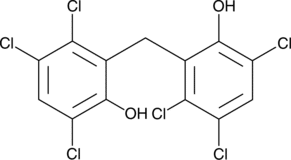 Hexachlorophene is an organochlorine antiseptic and antibacterial biocide that inhibits growth of S. aureus (MIC = 1.56 ?g/ml), E. faecium isolates from fresh produce (MICs = 5-50 mg/l), Salmonella isolates from meats (MICs = 2.5-25 mg/l), and Pseudomonas isolates from slaughterhouse surfaces (MICs = ?0.0025-?0.25 mg/l).{41505,41506,41507,41508} It inhibits infection of mouse astrocytoma DBT cells by a recombinant form of the murine coronavirus mouse hepatitis virus (MHV; IC50 = 1.2 ?M).{41509} Hexachlorophene inhibits recombinant human glutathione transferases P1-1 and A3-3 (IC50s = 9.7 and 50 = 4.61 ?M).{41510,41511} In vivo, hexachlorophene is toxic to fasted and non-fasted rats with LD50 values of 215 and 165 mg/kg, respectively.{41512}