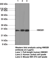High Mobility Group Protein B1 (HMGB1) belongs to the HMGB family and contains two HMG box DNA-binding domains. It is a highly conserved, ubiquitous protein present in the nuclei and cytoplasm of nearly all cell types, and is a necessary and sufficient mediator of inflammation during sterile and infection-associated responses. HMGB1 also act as DNA nuclear binding protein that has been shown to be an early trigger of sterile inflammation in animal models of trauma-hemorrhage via the activation of the Toll-like receptor 4 (TLR4) and the receptor for the advanced glycation endproducts (RAGE).{20300} It is reported that the level of HMGB1 is elevated during sterile tissue injury, infection, lethal endotoxemia or sepsis, collagen-induced arthritis, and ischemia-reperfusion induced tissue injury.{20304}
