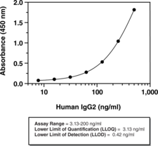 Cayman’s Human Therapeutic IgG2 ELISA Kit is an immunometric (i.e. sandwich) assay that can be used for the quantification of human IgG2 in monkey or rodent plasma and serum without prior sample purification. The standard curve spans the range of 3.13-200 ng/ml, with a lower limit of quantification (LLOQ) of 3.13 ng/ml. The assay has been validated in serum from cynomolgus monkey, rhesus monkey, and rat. Although a human monoclonal IgG2 antibody is supplied as a standard, we acknowledge that minor differences in protein structure or post-translational modification may exist between our standard and the human IgG2 test article that is being assessed by the customer and that these differences could lead to inaccuracies in the quantification of the test article. Thus, we anticipate that many of our customers will prefer to use their own purified therapeutic monoclonal IgG2 as the standard in this ELISA. In that event, we recommend that the customer test their own standard in the ELISA at a similar dose range as the standard provided in the kit.