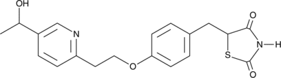 Hydroxy pioglitazone is a major metabolite of the peroxisome proliferator-activated receptor ? (PPAR?) agonist pioglitazone (Item Nos. 71745 | 22263 | 10028).{48274} It is formed from pioglitazone by the cytochrome P450 (CYP) isoform CYP2C8 with minor contributions from CYP3A4.{48275} Hydroxy pioglitazone binds to PPAR? (Ki = 1.2 ?M) and activates PPAR? in a time-resolved FRET (TR-FRET) assay (EC50 = 2.1 ?M).{48274}