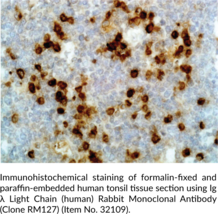 Ig? light chain is one type of light chain found in immunoglobulins, which are part of the immunoglobulin superfamily of glycoproteins that plays a central role in the adaptive immune response.{28520} Immunoglobulins are produced by B cells and later secreted by plasma cells as antibodies.{55225} They are composed of two heavy chains of approximately 50 kDa each and two light chains of approximately 25 kDa each.{28520} The heavy chains are linked together by disulfide bonds to form an Fc region and also combine with the light chains to form the Fab region, which mediate receptor and antigen binding, respectively.{55171} Mammalian immunoglobulins contain either Ig? or Ig? light chains, each of which are composed of a constant and variable domain.{55225,28687} The ratio of Ig? to Ig? light chain-containing antibodies varies between species, with ratios of 20:1, 2:1, and 1:20 in mice, humans, and cattle, respectively. In systemic amyloidosis, a clonal population of plasma cells produces light chains that form amyloid fibrils, and the type of free light chains (FLCs) produced is predominantly Ig? with an Ig? to Ig? ratio of 1:3 or, in amyloidosis patients with nephrotic-range proteinuria, 1:5.{52650} Cayman’s Ig? Light Chain (human) Monoclonal Antibody can be used for ELISA, flow cytometry (FC), immunocytochemistry (ICC), and immunohistochemistry (IHC) applications. The antibody recognizes the ? light chain from human samples.