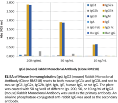 Immunoglobulin G (IgG) is a member of the immunoglobulin superfamily of glycoproteins that plays a central role in the adaptive immune response.{28520} It is produced by B cells and later secreted by plasma cells and is the most abundant circulating antibody in human and mouse serum.{28520,55170,55174} IgG consists of two heavy chains of approximately 50 kDa each and two light chains of approximately 25 kDa each.{28520} The heavy chains are linked together by disulfide bonds to form an Fc region and also combine with the light chains to form the Fab region, which mediate receptor and antigen binding, respectively.{55171} IgG exists as four isotypes in mice: IgG1, IgG2b, IgG3, and, in a strain-specific manner, IgG2a or IgG2c.{55172,53858} IgG3 production is driven by bacterial- or viral-associated antigens, including HIV-1 and Staphylococcus antigens, and occurs early in the immune response following IgM class-switching.{55170,52653} IgG3 binds to and neutralizes pathogens, as well as activates complement and opsonizes bacteria, leading to complement-dependent cytotoxicity (CDC) and antibody-dependent cell cytotoxicity (ADCC), respectively. Serum IgG3 levels are increased in patients with primary biliary cirrhosis, Sjögren’s syndrome, systemic sclerosis, or systemic lupus erythematosus (SLE).{52654} Cayman’s IgG3 (mouse) Rabbit Monoclonal Antibody can be used for ELISA and Western blot (WB) applications. The antibody recognizes the Fab region of IgG3 from mouse samples.