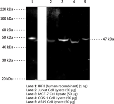 Interferon regulatory factor 3 (IRF3) is a member of the IRF family that plays a crucial role in activation of innate immunity and inflammation in response to viral infection, functioning as a molecular switch for antiviral activity.{39335,39336,39338,39337,39339} Double-stranded RNA generated during a viral infection leads to IRF3 activation through serine/threonine phosphorylation by TBK1 (Item No. 22817) or IKK? (IKBKE) kinases, which induces a conformational change leading to its dimerization, nuclear localization, and association with CREB binding protein (CREBBP)/p300.{39335,39336,39338,39334} The complex formed by this association, known as DRAF1, activates transcription of interferon ? (IFN-?) and IFN-? as well as other IFN-induced genes, which play a critical role in the type 1 IFN-dependent immune response.{39335,39334,39339} Cayman’s IRF3 Polyclonal Antibody can be used for Western blot and ELISA applications. The antibody recognizes IRF3 at ~47 kDa from human samples.