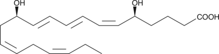 Leukotriene B5 (LTB5) is a leukotriene with diverse biological activities.{36392,36393,551,2238,330} It is a metabolite of eicosapentaenoic acid (EPA; Item Nos. 90110 | 90110.1 | 21908) formed through the 5-lipoxygenase (5-LO) pathway.{719} LTB5 increases contraction of bullfrog lung strips ex vivo in a concentration-dependent manner.{36392} In vivo, LTB5 (100 nM) reduces tumor volume in mice injected with Tm1 murine melanoma cells.{36393} LTB5 also elicits chemokinesis and lysosomal enzyme release from polymorphonuclear leukocytes (PMNLs) 20- to 30-fold less, and induces platelet aggregation 8-fold less, potently than LTB4 (Item No. 20110).{551,2238,330}