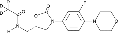 Linezolid-d3 is intended for use as an internal standard for the quantification of linezolid (Item No. 15012) by GC- or LC-MS. Linezolid is a synthetic oxazolidinone antibiotic with activity against a wide range of Gram-positive bacteria, including resistant strains of several species, such as methicillin-resistant S. aureus (MRSA), penicillin-resistant pneumococci, vancomycin-resistant enterococci, various anaerobic bacteria, and several mycobacteria and streptococci (MICs = 2-4 mg/ml).{22653} Linezolid inhibits protein synthesis by binding to domain V of the 23S ribosomal RNA of the 50S subunit of bacterial ribosomes. In vivo, linezolid (50 mg/kg) reduces pulmonary MRSA load in spontaneously breathing and mechanically ventilated rabbits.{36681} Formulations containing linezolid have been used to treat MRSA infections.