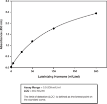 Luteinizing hormone (LH) is a glycoprotein produced by the pituitary gland and consists of two subunits with a total molecular mass of approximately 30 kDa. The ?-subunit is identical to the ?-subunit of other pituitary hormones, such follicle stimulating hormone (FSH), thyroid stimulating hormone (TSH), and chorionic gonadotropin (hCG). The ?-subunit is unique to LH and confers the specific biological activity to the molecule. Luteinizing hormone stimulates ovulation and the development of the corpus luteum, and maintains the function of the corpus luteum during the first two weeks of pregnancy. In males, LH stimulates the production of testosterone by the testis. Cayman’s Luteinizing Hormone ELISA (human) Kit is an immunometric (i.e., sandwich) ELISA which can be used to measure luteinizing hormone within the range of 0.5-200 mIU/ml. This assay offers specific and sensitive analysis of LH in human serum and has not been validated for other types of samples.